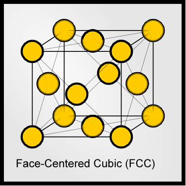 FCC означает « гранецентрированный куб», который является одной из наиболее распространенных и стабильных кристаллических структур. Чтобы понять, как выглядит кристалл FCC, представьте куб с атомом в каждом углу и каждой грани куба. Так и есть в FCC!