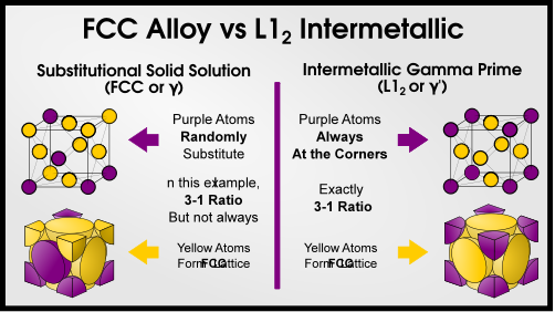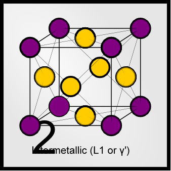 В 'структура упорядочена. Атом Al всегда сидит в углу, а Ni сидит на лице. Также может быть замена-нет никакой регулярности, которая мешает Ni идти в угол, но изображение справа показывает предпочтительное состояние. Если атомы расположены таким образом, фаза равна L12. Если нет предпочтений, фаза-это просто FCC.